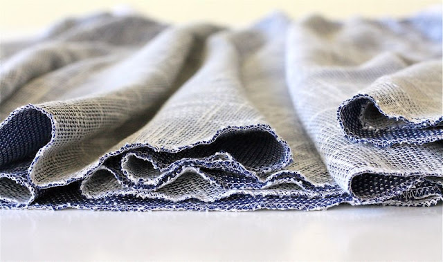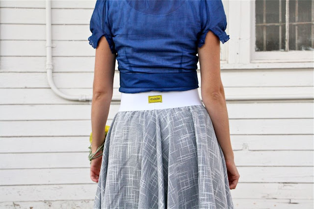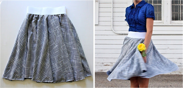 The fabric is a synthetic (polyester) tweed-like fabric that caught my eye one day in the store. It had a beautiful drape and I had a feeling those woven lines would look great, cut on the bias. The color is blue underneath with specks of it peeking out on the white side. I simply serged around the hem and added the standard 3 inch polyester elastic on top.